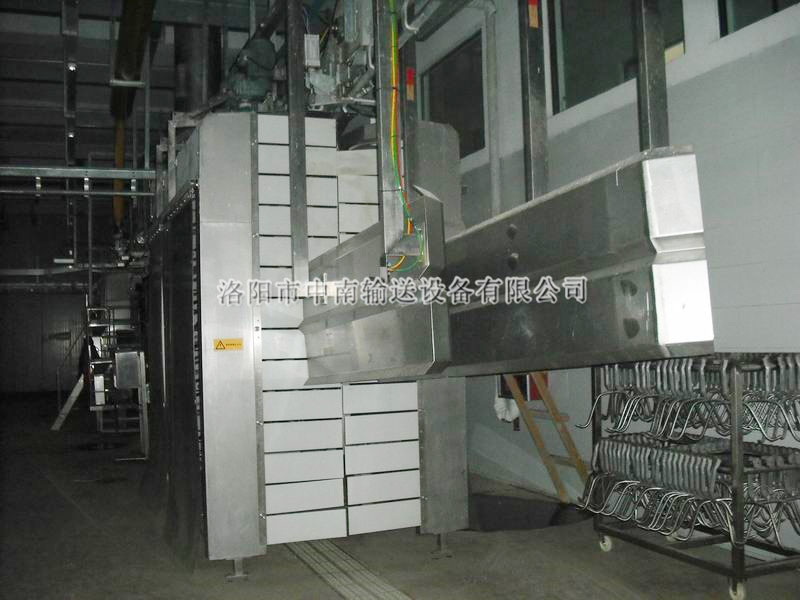 15516371888 本機對懸掛輸送線(xiàn)上傳送運行中的毛豬,進(jìn)行機械刷洗。該機采用對稱(chēng)直立滾筒,,外接橡膠條,以及沖淋?chē)娝?,對豬體進(jìn)行洗刷。本機外型結構簡(jiǎn)潔,使用維護方便,是大中小型肉類(lèi)加工廠(chǎng)選擇的設備。
